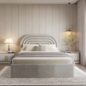 This bed frame features a distinctive curved headboard with an eye-catching pattern, combining elegant design with everyday functionality. Built for durability, the frame offers a solid and supportive foundation for restful sleep. Beneath the base lies a generous ottoman storage compartment, ideal for keeping extra bedding, clothing, or other essentials neatly tucked away. With its graceful headboard and hidden storage, this bed frame is a stylish and practical addition to any bedroom.