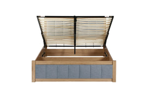 The Belmont Ottoman Bed is the ultimate fusion of style, storage, and comfort, perfect for any modern bedroom. The bed features a beautifully crafted oak-effect frame that adds warmth and sophistication to your space, complemented by a soft grey/blue fabric headboard and footboard that bring a contemporary and inviting touch to the design.