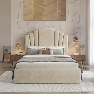 The Celestial Bed Frame combines style and functionality for an ideal sleeping solution. The headboard showcases an intriguing line pattern, adding visual appeal, while the footboard maintains a sleek, minimalist design. This creates a modern and balanced aesthetic.