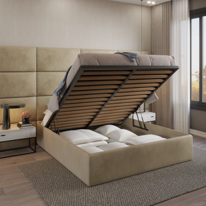 This bed frame is designed with a broad headboard featuring a refined rectangular pattern, offering both visual appeal and a supportive backdrop for your mattress. The highlight lies in its built-in base, which lifts to unveil a generous storage compartment—ideal for storing extra bedding, seasonal clothing, or other items you’d prefer tucked away. Merging modern style with everyday practicality, this bed frame is a smart and elegant choice for any bedroom.