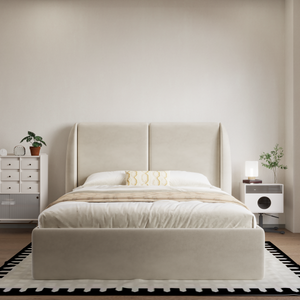 Soft Upholstery: Dressed in a neutral, light-toned fabric, the entire bed frame exudes a calming and inviting presence, blending seamlessly with diverse decors.