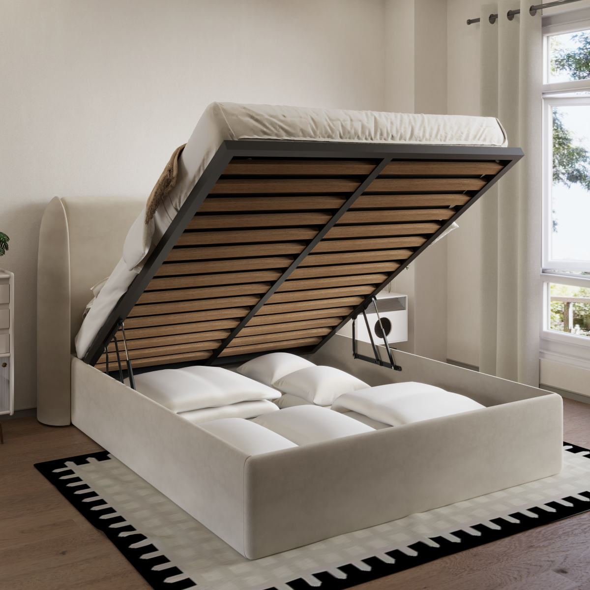 Concealed Storage: Discover ample hidden storage beneath the mattress, easily accessible with an ottoman gas-lift mechanism, perfect for keeping your space tidy.