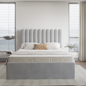Distinctive Headboard: A tall headboard features clean, vertical channels, creating a refined and visually appealing backdrop for your sleep space.