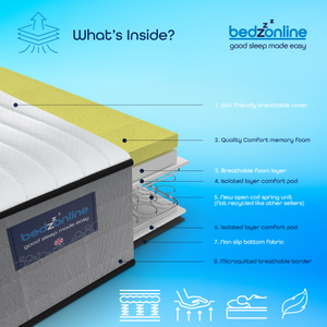 This mattress combines the comfort of memory foam with the support of inner springs to provide a medium-firm feel. With rows of specially reinforced coils along the edge, Regardless of your body type or sleep position, Orthopedic Memory Foam Spring mattress provides you with an excellent sleeping experience. It's skin-friendly and breathable with its knitted fabric that you’ll feel like sleeping on a cloud. The mattress offers superior breathability and holds you up well, so you won't feel stuffy or uncomfortable and will wake up energetic!