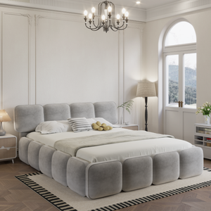 Distinctive Cushioned Design: Features a unique, cloud-like upholstered headboard and footboard composed of individual, soft-edged panels in a calming grey tone.
