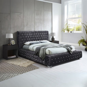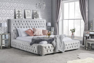 The Grande bed frame is upholstered in polyester with silver feet and comes in a beautiful crushed steel velvet.