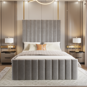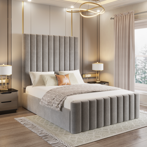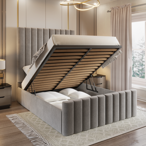 The Indigo Bed Frame features a tall headboard adorned with a sleek vertical line pattern, bringing a refined look to any bedroom. The footboard mirrors this design for a cohesive finish. Its standout feature is the hidden storage beneath the frame, which lifts to reveal a spacious compartment—perfect for storing extra blankets, pillows, or seasonal items. Offering both aesthetic appeal and everyday functionality, the Indigo is an excellent choice for a stylish yet practical bedroom setup.