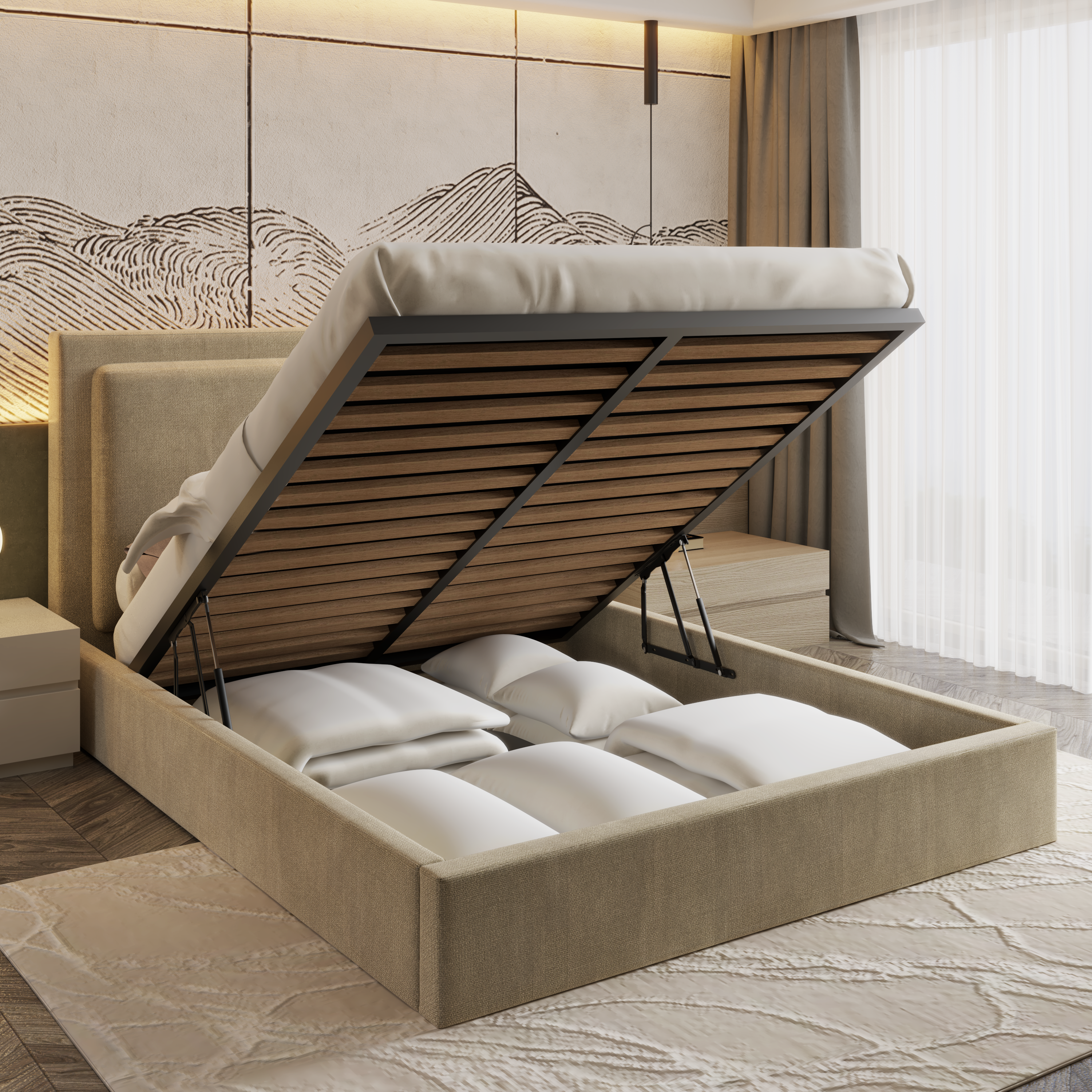 Its standout feature is the generously sized ottoman storage compartment, seamlessly integrated beneath the frame. Effortlessly lift the base to reveal ample space for bedding, seasonal clothing, or household essentials, all neatly tucked away yet within easy reach.