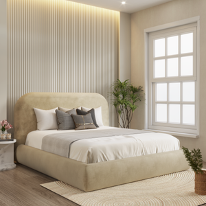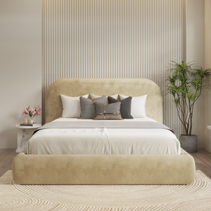 The Joyful Bed Frame showcases a sleek and minimalist design. Its headboard features a smooth, plain surface with softly curved edges, creating a warm and welcoming feel. The footboard mirrors this simplicity, contributing to a clean and refined look.