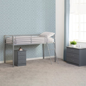 Kora Mid Sleeper Bed Frame. Offering a practical sleeping solution for both children and spare rooms, this bunk bed is simple yet effective. A metal frame offers a sturdy structure, perfect for children’s rooms. Finished in white, black or silver, this bunk bed will seamlessly fit into any interior. This entry level bunk bed has a clean, universal design as well as metal slats to support sleep. Delivered in 1 box, this item is easy to assemble and is perfect for those on a budget.