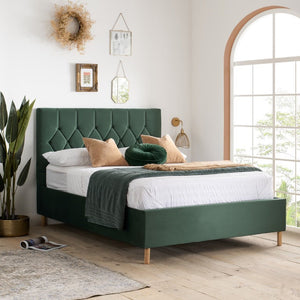 The Loxley bed frame is upholstered in polyester with complementary light feet and is available in grey, green and blue.