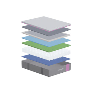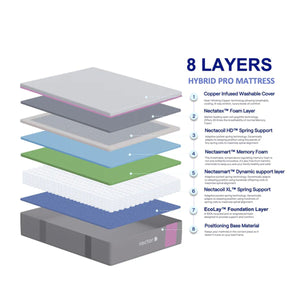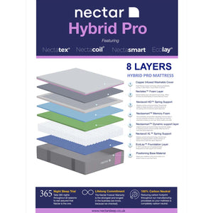 At the heart of the Hybrid Pro lies a harmonious fusion of Nectatex™ cooling fabric and Nectar Smart™ foam, offering adaptive support that intuitively responds to your body’s unique contours. These cutting-edge layers ensure pressure relief, optimal spinal alignment, and a cool, dry sleep environment all night long.