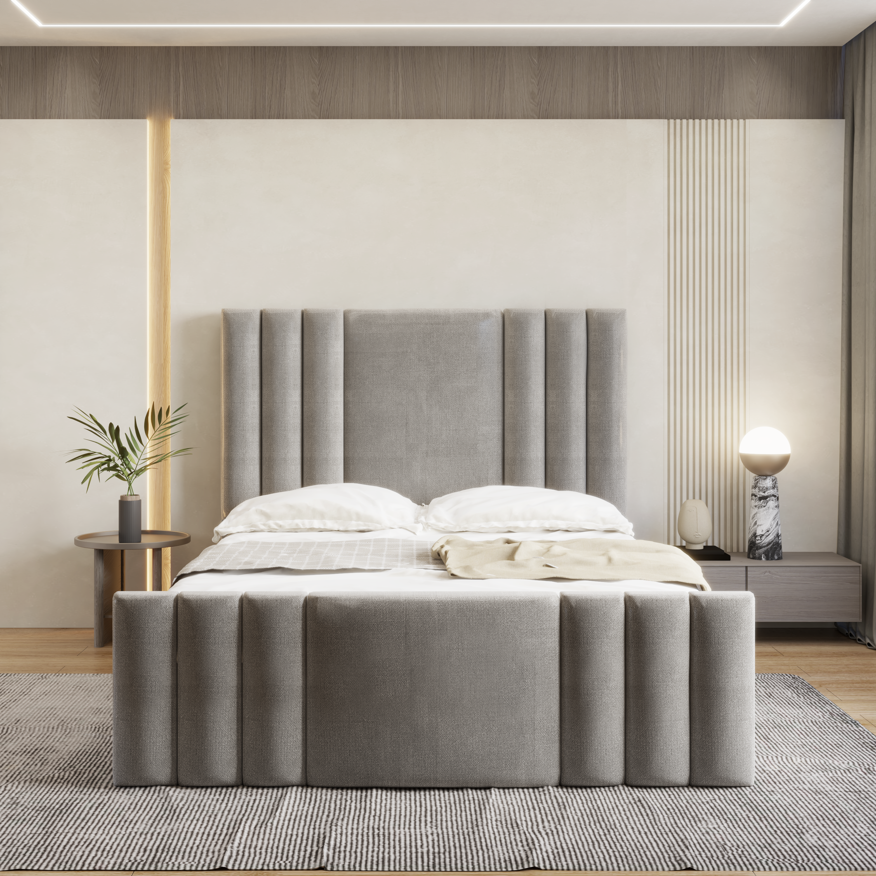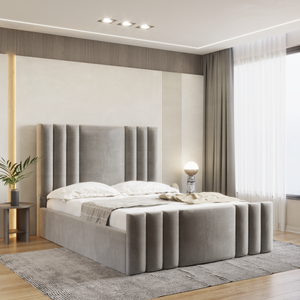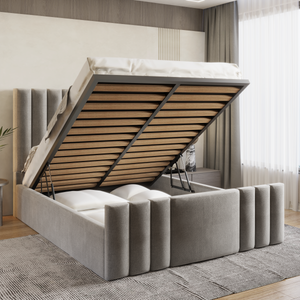 The Ruby Bed Frame features a sleek headboard and footboard, both adorned with a pattern of vertical straight lines, giving it a modern and stylish look. Beneath the frame, a spacious compartment provides convenient storage space for extra bedding, clothes, or other essentials, helping you keep your bedroom organised and clutter-free.