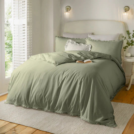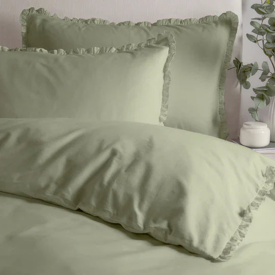 The minimalist design, featuring delicate ruffle detailing along the duvet and pillowcases, adds a refined yet charming aesthetic. Suitable for both traditional and modern interiors, the versatile tones and understated elegance make it an ideal choice for those who value timeless design. This set thoughtfully merges comfort with a sense of natural inspiration, perfectly balancing style and practicality.