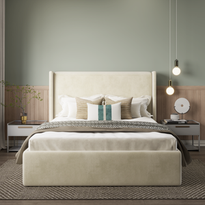 Probably the most striking feature of the bed is the tall wingback headboard, exquisitely upholstered in soft, cream-colored fabric—a touch of luxury and warmth for the space. Clean lines and very little embellishment let it fold into modern to transitional interior decor styles easily.