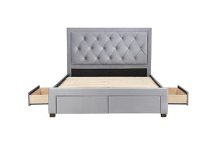 Upholstered in a grey luxurious fabric and features handy storage drawers to stowaway away your belongings.